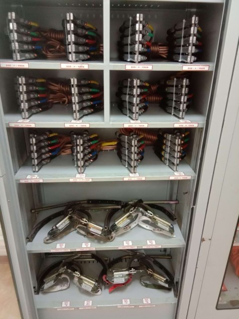 上面一組安全工具柜的存儲則是簡單暴力,兩層接地線,分別由支架固定,其中低層兩邊也分別放兩排。整體看起來整體規(guī)范,具有較強的視覺沖擊。