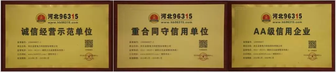 金能電力榮獲河北96315“誠信經營示范單位”、“重合同守信用單位”、“AA級信用企業”