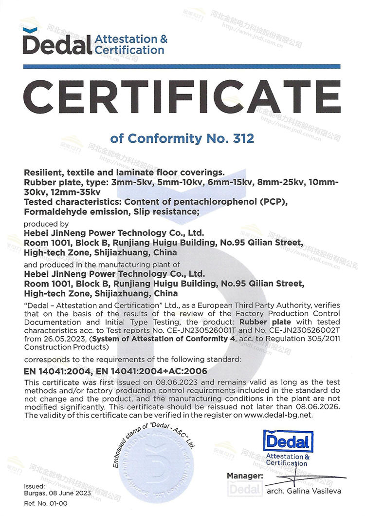 絕緣膠墊是電力安全不可或缺的一部分,其質量和性能對于保護人員的安全至關重要。通過獲得CE認證,并結合已于先前通過的國際電工協會IEC耐壓性能檢測報告,說明金能電力絕緣膠墊的產品質量、安全性和環保等級的肯定已經得到主管機構的認可,產品符合歐盟的相關標準和法規要求。