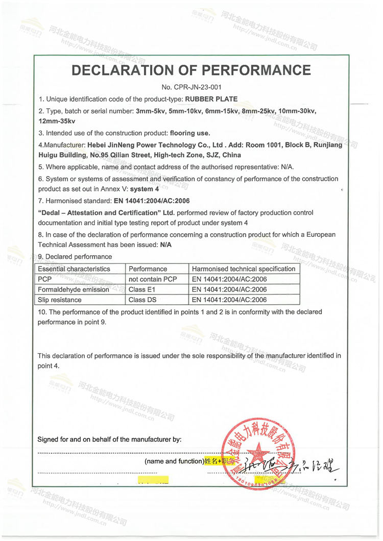 金能絕緣膠墊完成歐盟CE認證,通過歐標E1級環保標準