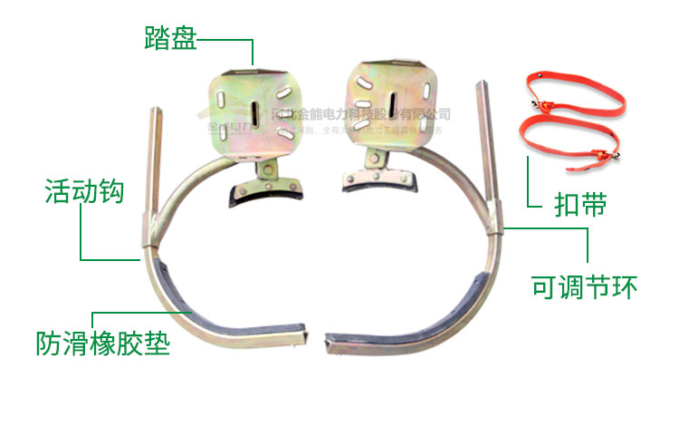 金能腳扣配有可調(diào)節(jié)套環(huán),腳扣可以靈活調(diào)節(jié)。腳扣借助人身重量,緊扣電線桿,產(chǎn)生較大的摩擦力,易于攀登,操作輕巧。